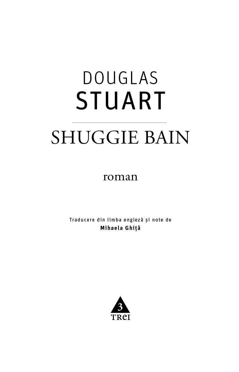 Adevărul fie spus, fetele erau trei femei între două vârste din Glasgow. Ena, capul răutăților, era o femeie slabă ca un ogar, cu o mină impasibilă și păr slinos. Nu prea avea sprâncene, dar avea o urmă de mustață, chestie care lui Shuggie i se părea nedreaptă. Ena era grosolană chiar și pentru capătul ăsta al Glasgow-ului, dar în același timp se arăta bună și mărinimoasă în felul în care sunt adesea oamenii obidiți. Nora, cea mai tânără dintre cele trei, își purta părul strâns tare la spate și prins cu un elastic. Ochii, la fel ca ai Enei, îi erau mici și ageri și, la treizeci și trei de ani, era deja mama a cinci copii. Ultima din grup era Jackie. Jackie se deosebea de celelalte două prin faptul că încă mai aducea cu o femeie. Era o mahalagioaică cu gura mare, un dulap de femeie, grasă și pieptoasă. Pe ea o simpatiza Shuggie cel mai mult.